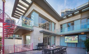 看標題和圖片,還以為是別墅類的民宿,什麼免費ktv棋牌室游泳池都是沒有的,就是普通的高層公寓,住的都是來旅遊的人,一共二十多層電梯每次要等超級久,房間可以超近看海就這個優點,下樓去海邊特別近,房間衞生一般般吧
