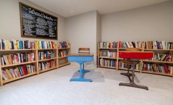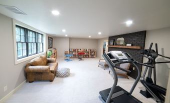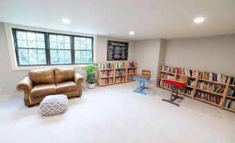 The Lower Level Living Room - Enjoy reading? We have a library with 1,000s of books to choose from and an in home gym with an elliptical and treadmill. This space is perfect for families with small children. There is plush carpet, children's school desks, a foosball table, an indoor playhouse, and two vintage children sized school desks. We also include a high chair, pack n play, and a few totes of toys!