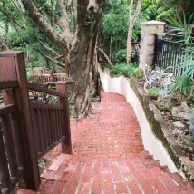The winding path downstairs is a unique feature; though not large, it meanders and undulates, making it a great place for an after-dinner stroll. And indeed, we spotted the legendary lazy cat!