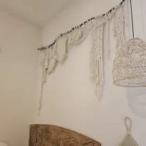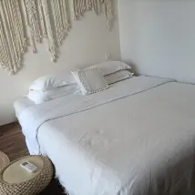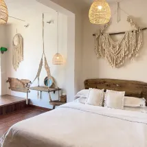 Stepping into this room, I was immediately embraced by a gentle ambiance, a beautiful blend of bohemian chic and natural wood textures. Hand-woven macrame tapestries draped from the walls, rattan pendant lights cast a warm glow as soft as morning mist, and even the headboard showcased the natural grain of raw wood. Every detail seemed to whisper, 'Slow down and savor the moment.'
