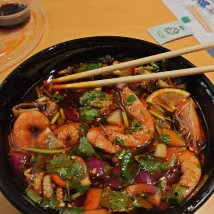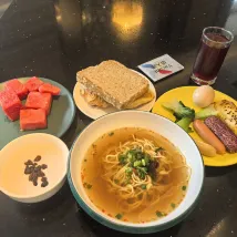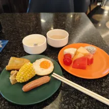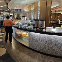 The breakfast buffet was well-arranged and easy to navigate. The made-to-order noodles were quite good, but the other options were generally average. The cooked vegetables were cold, and the pastries and desserts were too hard and excessively sweet.