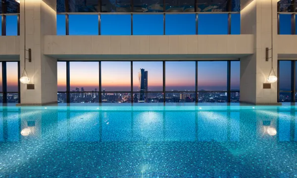 This hotel features a sky lobby located on the 46th floor. Situated in Nanshan, it's right next to Shenzhen University, which you can visit by booking an appointment via your phone. The subway station is conveniently located right outside, making transportation a breeze. The room comes with a large, spacious bathtub, and the overall environment feels quite expansive. The room facilities look pretty new, and it even has a 'Xiao Du' smart voice assistant. From the window, you can enjoy city views of the Shenzhen University campus and the nearby golf course, along with Shenzhen's vibrant night skyline. Their breakfast is also highly commendable, offering specialties like rice noodle rolls, cereal with yogurt, and Japanese cold dishes (such as spiral shell meat and wasabi octopus). All the usual breakfast items are available too; the bread and pastries are freshly baked, and the noodle, egg, and congee stations have substantial toppings and ingredients. There are no obvious downsides, so it's a big thumbs up! As for the gym and pool, the gym is a medium-sized facility with full equipment, and the infinity pool offers fantastic views, making it very photogenic.