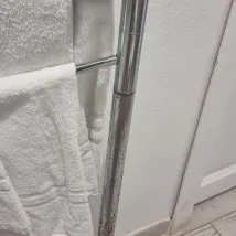 Il porta salviette, il tubo della doccia e la testata del letto erano arrugginiti e la tenda rotta.