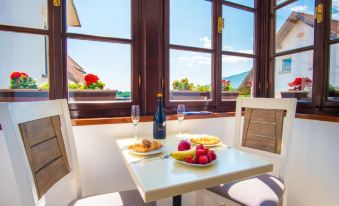In the square of the old centre of Radovljica. Historical old building with contemporary, self-contained renovation. Great soundproofing which was needed to almost fully drown out early church bells. Delicious wood box of breakfast materials provided to start the day.
