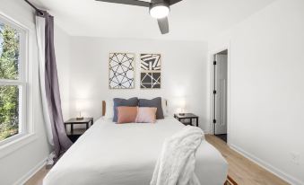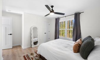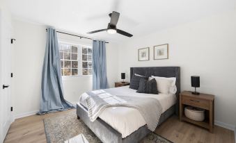 - Primary Bedroom: King bed with seating area, ceiling fan, attached ensuite full bathroom