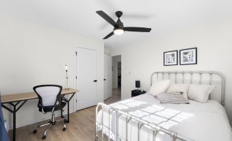 - Bedroom 2: Queen bed, ceiling fan, office desk and ergonomic chair