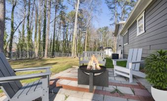 - Patio with Adirondack chairs and a Solo Stove fire pit