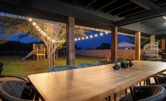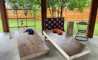 As you continue through the yard, you'll find our expansive firepit with ample seating for cozy nights under the stars, perfect for roasting s’mores. Each porch is equipped with a fan to help alleviate the Texas heat and keep away flying nuisances.About pets:Pets allowed: dogs less than 50 lbs per pet (limit 2 pets total).About checkOut:Check out before 10:00 AM.About children:Children allowed: ages 0-17.About customRules:TOILET TISSUE: The septic system is very sensitive. Only tissue that specifically says “septic safe” can go in the toilet and nothing else please..SHOES - If it is raining or has rained recently please no shoes inside the house to avoid tracking in mud.,GRILL / FIRE PIT - Please make sure propane is turned off when not in use. Scrub the grill when still hot to avoid buildup, empty/clean drip pan..About checkIn:Check in after 4:00 PM.About smoking:Smoking is not permitted.About minBookingAge:Minimum age to rent: 25.About events:No events allowed.