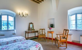 Stigliano 2 km from Rosia: Very old, historical residence "La Torre", 4 storeys, from the 12nd century, surrounded by trees and meadows. 3 apartments in the property. Above Stigliano 1 km from the centre of Rosia, 5 km from the centre of Sovicille, 20 km from the centre of Siena, in a sunny, elevated position, 100 m from the edge of the forest, 70 km from the sea, 4.5 km from the river. For shared use: property 1'000 m2 (fenced), terraced garden trees. Barbecue. In the house: lounge with TV, washing machine (for shared use). Parking at the house on the premises. Shop 2 km, grocery 2 km, supermarket 2 km, restaurant 300 m, bakery 2 km, bus stop "Rosia" 2 km, railway station "Siena" 20 km, sandy beach "Follonica" 70 km, thermal baths "Terme di Petriolo" 21 km. Golf course (18 hole) 7.5 km. Nearby attractions: Montalcino 45 km, San Gimignano 46 km, Massa Marittima 52 km, Pienza 62 km, Firenze 87 km. Please note: no lift. Baby equipment (included). Owner lives in separate semi-detached house. All houses/apartments are individually designed/furnished. "Torre 4", 3-room penthouse 80 m2 on 2 levels on 3rd floor. Spacious and bright, tasteful and romantic furnishings: 3nd upper floor: open living/dining room with dining table and kitchen corner. 1 double bedroom. Kitchenette (oven, 3 gas rings, toaster, kettle, electric coffee machine) with TV (flat screen). Shower/bidet/WC. Top floor: (spiral staircase) open large, 1 double bedroom with panoramic window. Exit to the terrace. Natural stone floors. Terrace, patio. Terrace furniture, barbecue, deck chairs, box-room. Marvellous panoramic view of the countryside. Facilities: iron, mosquito net, children's high chair, baby cot for up to 2 year olds, hair dryer. Internet (WiFi, free). Parking (1 car) at the house. Please note: not suitable for small children. Non-smokers only. Maximum 1 pet/ dog allowed. No lift. IT052034C260NHXRVD