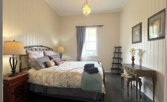 The villa boasts three luxurious bedrooms and an exquisite bathroom, adorned with antique gold tapware, a solid concrete bath and a century-old coloured glass window steeped in a history all its own. The curved stone mosaic shower, complimented by a beautiful leadlight window, overlooks the tranquil backyard gardens.