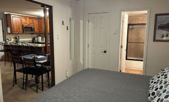This one bedroom/one-bathroom sleeps 4. We have a well-stocked kitchen and updated bathroom with shower doors. Great barn doors between the living room and bedroom.