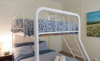 Main Bedroom with Queen Size Brass Bed and built in robe, second bedroom a family room with Single Bed and trio bunk with double bed and single bunk.