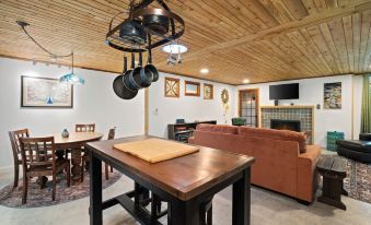 Step into a colorful and cozy living room designed to make you feel right at home. Vaulted ceilings, warm wood accents, and vintage-style rugs create an inviting ambiance, complemented by a propane fireplace and smart TV for evening entertainment. Oversized windows bring in abundant natural light and views of the surrounding trees.
