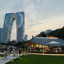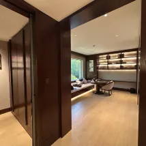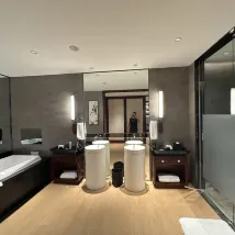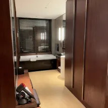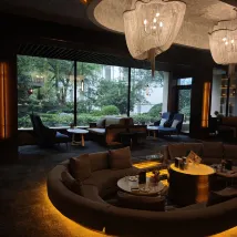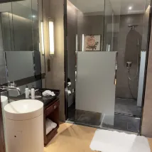 The hotel's location near Suzhou Center makes dining and shopping incredibly convenient. Our room was well-appointed, featuring a mini-bar, a bathtub, a walk-in shower with separate wet and dry zones, and double vanity sinks – ideal for two guests. The hotel environment is superb, a true urban oasis with a beautiful garden. From the rooftop, you can enjoy views of Jinji Lake, and the garden even offers direct access to the Jinji Lake boardwalk, which is perfect for an evening stroll after dinner. The front desk staff were absolutely amazing; they upgraded our room and kindly provided complimentary cocktail vouchers for the hotel bar.