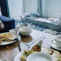 For breakfast, I think it's okay. There are porridge, side dishes, rice, and lettuce salad.