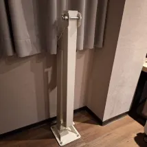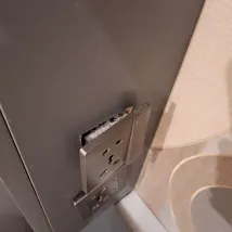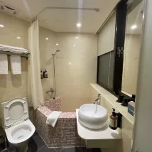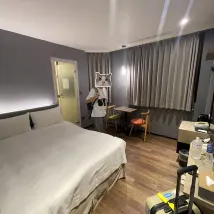 The hotel room and bathroom are notably small, with visible dust around the table. A pillar positioned in front of the bed further limits the space, making it difficult to fully open a medium-sized suitcase. Additionally, the overly soft bed and pillows result in an uncomfortable sleeping experience.