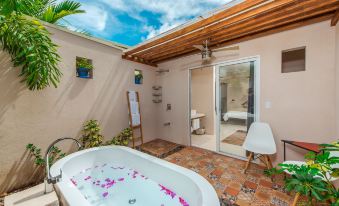 The name is fitting...charming! We thoroughly enjoyed our time at La Ramona. The hotel is tucked away in a neighborhood away from the main *****, which is what we wanted. The staff were friendly and helpful. The communal kitchen had everything we needed, including a made-to-order breakfast every morning. Our room had an outside bathtub and shower on a private patio. It was very quaint and romantic. We enjoyed our stay and would go back. Thank you!
