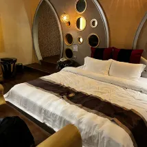 Located about a 20 minute walk from the nearest MRT. Room was clean but had a faint smell of smoke. The TV/Music controls in the bedroom and in the bathroom are very old and not fully functional— many buttons on the controller do nothing at all. TV does not have Netflix or YouTube so you can only watch local channels. No door on the toilet room. Breakfast is McDonald's and the vegetarian option was a single red bean bao bun. The food was not delivered directly to the room, instead it was placed on a shelf in the car garage so you must leave the room and take the elevator downstairs to retrieve it. Seems more like an hourly/party hotel than somewhere for comfortable stay.