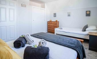 The modern kitchen is fully equipped with everything you need for a home-from-home stay: a dining table, fridge, oven, hob, microwave, dishwasher, kettle, and toaster. It’s the perfect space to prepare and enjoy meals together.