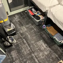 The room wasn’t very big, but it was just the right size for two people. We could store two 30-inch suitcases under the bed. All the essential amenities were provided, except for a refrigerator.