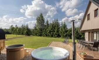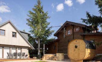 Modern holiday development "Pod Liščím kopcem". On the outskirts, in a quiet, sunny position. For shared use: property. Private: terrace, garden furniture, barbecue. In the complex: sauna, hot tub (all included), central heating system. Parking at the house. Shop 2 km, supermarket 4 km, restaurant 4 km, bus stop 300 m, railway station "Horní Branná" 2.5 km, indoor swimming pool 1.5 km, thermal baths "Janské Lázně" 18 km. Golf course (9 hole) 11 km, tennis 2 km, walking paths from the house, cycle lane 100 m, ski lift 3 km, ski school 3 km, cross country ski track 3 km, children's playground 300 m. Well-known ski regions can easily be reached: Kněžický vrch-Vrchlabí 3 km, Herlíkovice 7km, Dolní Dvůr 9 km, Cerný Důl, Černá Hora-Janské Lázně 12 km. Hiking paths: Špindlerův Mlýn, Stezka korunami stromů 16 km, Sněžka (1603 m), ZOO Dvůr Králové 32 km. Cooling tube also available. "Pod Liščím kopcem 6+4", 4-room house on 2 levels. Comfortable and modern furnishings: living room with Scandinavian wood stove and TV. Exit to the terrace. Kitchenette (oven, dishwasher, 4 ceramic glass hob hotplates, kettle, microwave) with dining table. Upper floor: 1 room with 1 double bed. 1 room with 1 x 2 bunk beds, 1 double bed. 1 room with 1 x 2 bunk beds, 1 double bed. Bath/WC. Terrace. Terrace furniture. Facilities: Internet (WiFi, free). Please note: suitable for families. Non-smoking house. Maximum 1 pet/ dog allowed.