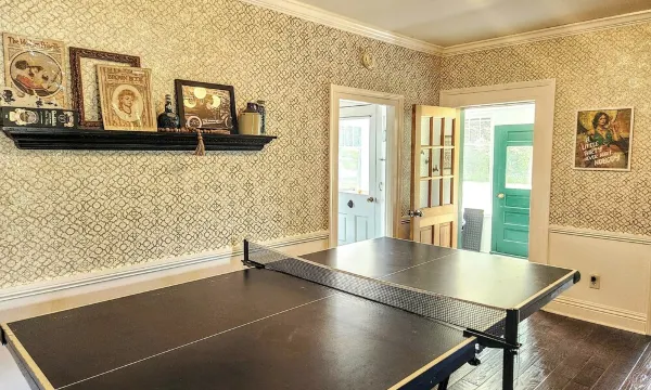 The speakeasy is complete with kitchenette, movie room, wii, indoor games, ping-pong, darts, foosball, and other hidden gems for your party to enjoy!