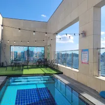 This is a hotel I visit often. I visit it because it is good for children to play in the water. The rooftop pool has a nice atmosphere and is good for children to play in the water, but the staff is not that friendly.