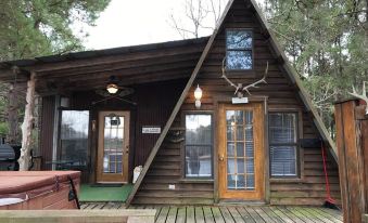 This amazing A-frame style cabin is so waterfront it is actually hanging over the water of one of our 6 fishing ponds. This cabin has a king bed downstairs and an open loft area upstairs with 2 twin beds. It has a kitchen with full size refrigerator, large oven/stove, pot, pans, dishes microwave and K-cup coffee maker. Outside It has a private hot tub an outside shower and charcoal grill on the deck overlooking the water. There is a nice size yard area that has a fire pit area and room for outdoor games.