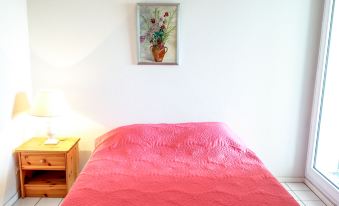 Vaux sur Mer 2 km from Royan: Large residence "Parc de Pontaillac", 4 storeys. 215 apartments in the residence. In the district of Pontaillac, 2 km from the centre of Vaux sur Mer, 2.3 km from the centre of Royan, in a busy position in the residential district, 200 m from the sea, 200 m from the beach. For shared use: swimming pool angular fenced (15 x 7 m, seasonal availability: 01.Jul. - 31.Aug.). In the house: lift, storage room for bicycles. Public parking on the road. Shop 200 m, supermarket 1.4 km, restaurant, bar, bakery, café 200 m, bus stop "Porte Océane" 100 m, railway station "Royan" 3.2 km, sandy beach "Pontaillac" 200 m, park "Luna Park (Juillet-Août)" 17 km, indoor swimming pool 3 km, thermal baths "Thalassothérapie Thalazur Royan" 1.7 km, lake Métairie - Royan 1.5 km. Sports harbour 2.4 km, golf course (18 hole) 5.5 km, surf school 200 m, sailing school 2.5 km, tennis 2 km, indoor tennis centre 2 km, minigolf 550 m, riding stable 6 km, cycle lane 100 m. Nearby attractions: Casino Barrière 250 m, Palais des Congrès - Royan 2 km, Embarcadère Royan - Le Verdon 2 km, Zoo de La Palmyre 12 km, Hippodrome - La Palmyre 13 km, Centre aquatique Iléo - Ile d'Oléron 47 km. Please note: Additional accommodations can be booked. 3-room apartment 35 m2 on 2nd floor. Living/dining room with TV. Exit to the terrace. 1 room with 1 french bed (1 x 140 cm, length 190 cm). Exit to the terrace. 1 small room with sliding door with 1 pull-out bed (2 x 80 cm, length 190 cm). Kitchenette (3 hot plates, oven, microwave, electric coffee machine). Shower, sep. WC. Electric heating. Terrace 10 m2, north facing position and, east facing position. Terrace furniture. Facilities: washing machine. Internet (WiFi, extra). Please note: 1 small pet/ dog allowed. Smoke alarm.