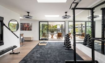- Gym includes Tonal workout machine, free weights, yoga/pilates mats and accessories, fitness balls, and rollers.