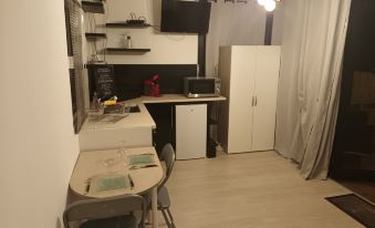 The studio is equipped with a well-appointed kitchen area, including a combined oven, a coffee maker, a hob, and all the utensils necessary to prepare your meals just like at home. Whether you want to prepare a quick breakfast or a gourmet dinner, you'll have everything you need right at your fingertips.