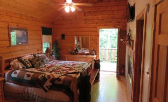 The Master Suite is a 'Honeymooner's Dream' with King Bed, lodge/pine tree decor, and private balcony. Enjoy the luxurious Master Suite Bath with 2 person heart-shaped Jacuzzi while watching the flames in the see-thru fireplace.
