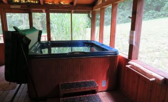 Relax in the 6 person Hot Tub on the screened porch surrounded by woods and romantic accent lighting, enjoy a bottle of wine by the outdoor fire pit under the trees or on the log swing. Enjoy a game of Pool in the loft watching the fire below, or relax in the rocking chairs on one of the many porches and enjoy watching the deer & wildlife passing by.