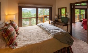 Centrally located Bluestone Chalet, overlooking the Blue Ridge Mountains & golf course in Hound Ears Club*: an updated, 3000 sf two-story 4+ bedroom private vacation home with 2-story cathedral ceiling & windows, soaring double sided bluestone gas fireplace, wood floors in all living/areas + primary bedroom and a large deck overlooking the mountains. Enjoy our high country vacation home where you can do as much - or as little - as you want. This gorgeous home features a large Great Room with vaulted wood & beam ceiling, impressive 2-story double sided bluestone gas fireplace and a wall of windows and large deck overlooking the mountains and golf course. All new beds, bedding and comfortable furnishings including 70” TV in the media room. Our home is perfect for families (large and small) to enjoy all that the lovely NC mountains have to offer.