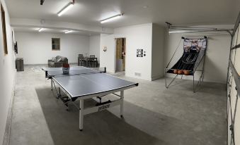 This stunning home offers a plethora of amenities. It boasts a game room equipped with a ping pong table, two-person basketball, cards, board games, and much more. The charming deck overlooks the woods, providing the perfect spot for a morning coffee or an evening grilling session. At night, gather around the fire in the updated and well-maintained fire pit to roast marshmallows with the family. Additionally, there's a hot tub adjacent to the fire pit for a relaxing soak. Traveling with a dog? They're welcome here as well.