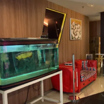 The lobby has a magnificent arowana tank, which is quite impressive. The hotel is close to all the nearby attractions, and dining options are also convenient. It's located on the 8th floor of a large hardware market. You can eat on the second floor, and the value for money is decent, but the food court closes quite early, by 5 PM, and it's not open on Sundays.