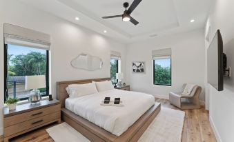 Nestled in Florida's vibrant Gold Coast, Wander West Palm Beach blends tropical luxury with coastal sophistication. This stylish retreat boasts a 2,000 sq ft rooftop terrace, outdoor pool, jacuzzi, a steam room, and modern master suite with bathtub. Featuring three spacious balconies and a dedicated home office, it offers the perfect balance of relaxation and productivity in a prime location.