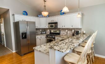 The kitchen area has a large dining table with 6 chairs and counter bar with 4 full chairs. It comes fully equipped with all pots, pans, drinkware, dinnerware, coffee maker, toaster, pack n play, iron, ironing board, hair dryer, Wii, XBox, DVD Player.