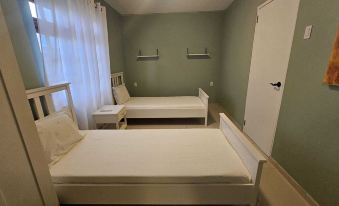 3 bedrooms: 2 single beds 1 queen bed and 1 double bed