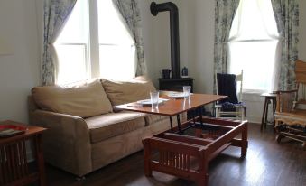 The recently renovated craftsman style home offers tons of natural lighting with large windows, and spaciously appointed rooms. The house also has blackout curtains for privacy and sleeping in. This family-friendly home has a fully equipped kitchen, as well as games, books, and a smart television with the option of signing in to your favorite subscriptions. The house offers 2 large bedrooms with queen sized beds as well as two full sized bathrooms with toiletries provided. The living room has an electric wood burning stove that provides heat or just ambiance with a flames only option. The living room also offers a coffee table that pops up for extra dinner seating or dinner and a movie style relaxation. The living room also offers a sleeper style sofa for extra guests.