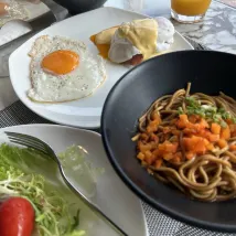 The highlight was definitely the lounge. The afternoon tea was superb, with small cakes constantly replenished, and the chocolate brownies were particularly delicious. The "Wild Boar Hour" (presumably their evening cocktail/happy hour) was also fantastic, offering a noodle station and individual hot dishes (like Tom Yum Goong seafood soup that day). A staff member named James was exceptionally enthusiastic and actively gave guests recommendations for local sights. Similarly, at breakfast, a gentleman named Bob was equally attentive and personable, making guests feel truly valued.