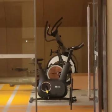 The front desk kindly upgraded me to a premium king room for free. It had large, floor-to-ceiling windows and a smart home system, allowing me to control everything via voice commands with 'Xiao Du'. I could also watch Tencent Video for free on the TV. The gym, though small, was well-equipped with a treadmill, elliptical, and other machines.