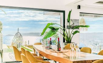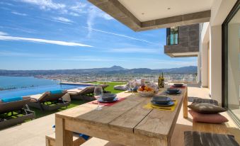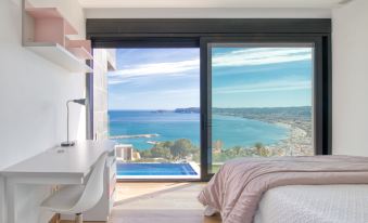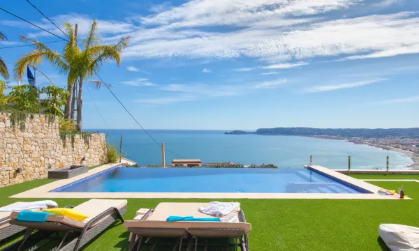 Villa Jakarta is a beautiful and impressive villa, modern in style, with fantastic views of the sea and the city of Jávea. Very large, very luxurious villa "Bali Infinity", 2 storeys. In the district of La Cuesta de San Antonio, 1 km from the sea, 1 km from the beach. Private: swimming pool (9 x 5 m, depth 110 - 180 cm, seasonal availability: 01.Jan. - 31.Dec.). Shower/WC in the pool area, outdoor shower, hot tub, terrace, garden furniture, barbecue, barbecue house. In the house: fitness room, hot tub, table tennis, lift, central heating system, air conditioning, laundry, washing machine, tumble dryer. Parking (for 3 cars) on the premises, single garage. Shop 1 km, supermarket 3 km, restaurant 1 km, bus stop 2 km, sandy beach "Arenal" 4 km pebble beach "La Grava" 1 km. Sports harbour 1 km, marina 1 km, surf school 1 km, sailing school 1 km, tennis 2 km. "Villa Bali Infinity", 7-room villa 650 m2 on 2 levels. Spacious and bright, very modern and luxurious furnishings: living/dining room with open-hearth fireplace, dining table, satellite TV and digital TV. Large kitchen (oven, dishwasher, 4 induction hot plates, toaster, kettle, microwave, freezer, electric coffee machine, cooking island). Shower/WC. On the lower ground floor: 1 room with 1 french bed (160 cm, length 200 cm), shower/WC. 1 room with 1 french bed (160 cm, length 200 cm), shower/WC. Upper floor: 1 room with 1 french bed (180 cm, length 200 cm), shower/WC. 1 room with 1 french bed (160 cm, length 200 cm), shower/WC. 1 room with 1 french bed (160 cm, length 200 cm), shower/WC. Large terrace. Terrace furniture, barbecue, deck chairs (3). Marvellous panoramic view of the sea and the resort. Facilities: washing machine, dryer, iron, hair dryer. Internet (WiFi, free). At the house. On the lower floor there is also a gym with hot tub and toilet. Garage for three cars. VT-484887-A // Reg. Nr.: ESFCTU000030700097180200000000000000CV-VUT0484887-A6