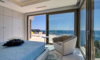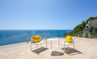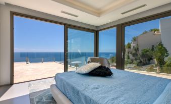 Privileged location in the bay of Granadella, this luxurious house is located on the front line with splendid panoramic views of the sea and the coast. Very large, very modern, very luxurious villa "Emma on the Roc", 4 storeys. In the district of Granadella, in a secluded, quiet, sunny position on a slope, 2 km from the sea, in a cul-de-sac. Private: property 1'300 m2 (fenced), swimming pool (5 x 14 m, depth 110 - 210 cm, seasonal availability: 01.Jan. - 31.Dec.) with internal staircase. Outdoor shower, garden furniture, barbecue house. In the house: fitness room, lift, air conditioning, burglar alarm system. Parking on the premises. Shop 9 km, supermarket 4 km, restaurant 2 km, bus stop 9 km, sandy beach "Arenal" 9 km, shingle beach "Granadella" 1.5 km, swimming bay 2 km. Sports harbour 9 km, marina 9 km, golf course (9 hole) 12 km, surf school 7 km, sailing school 7 km, tennis 7 km. Please note: car recommended. Groups of teenagers on request only. Neighbourhood highly sensitive to noise. Quietness and good behaviour expected. "Emma on the Roc", 6-room villa 600 m2 on 4 levels. Spacious and bright, modern and luxurious furnishings: open large living/dining room with satellite TV, international TV channels, air conditioning and forced-air heating. Exit to the terrace, to the swimming pool. Large, open kitchen (oven, dishwasher, 5 induction hot plates, microwave, freezer, electric coffee machine, cooking island) with bar. Sep. WC. Upper floor: 1 room with Dressing room with 1 french bed (180 cm, length 200 cm), bath/shower/bidet/WC, double hand-basin, air conditioning and forced-air heating. 1 room with 1 french bed (200 cm, length 200 cm), shower/WC, air conditioning and forced-air heating. Office with air conditioning and forced-air heating. Exit to the terrace. 2nd upper floor: 1 room with Dressing room with 1 french bed (180 cm, length 200 cm), bath/shower/WC, air conditioning and forced-air heating. Exit to the terrace. 1 room with 1 french bed (180 cm, length 200 cm), shower/WC, air conditioning and forced-air heating. Exit to the terrace. 3nd upper floor: with air conditioning and forced-air heating. Exit to the terrace. Bay window. Large terrace. Terrace furniture, barbecue, deck chairs. Marvellous panoramic view of the sea, the mountains and the countryside. Facilities: washing machine, dryer, iron, children's high chair, baby cot, hair dryer. Internet (WiFi, free). Parking at the house. AT-479257-A