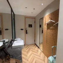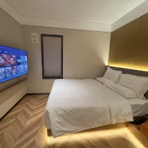 this hotel adopts the smart home concept. the room can be voice controlled by xiao du xiao du to turn off the lights, close the curtain, turn off the tv, etc. the toilet is also equipped with Japanese style tech. the room is spacious and designer pays attention to detail such as lighting does not shine into the eyes when lying on the bed. the light strip is bright enough and not dim. the shampoo and body wash are very good for my skin, moisturizing.
