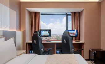 房間的景觀超棒,大窗户看出去城市景色一覽無餘,晚上燈光亮起來肯定更漂亮,躺在床上就能享受這份美景。有智能語音助手小度很方便,可以控制窗簾開關及燈光等!