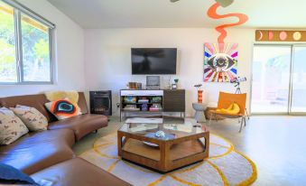 Put the "fun" in "funky" at this rainbow oasis designed to let your creative energy shine and lovingly curated with custom art and vintage furniture. Located <15 minutes from Joshua Tree National Park, Pioneertown and Landers, and <5 minutes from downtown Yucca Valley, you'll have the ultimate combo of convenience and privacy on 2.5 acres. Pour yourself a cocktail at the outdoor bar, shower under the stars, and relax by the fire pit or hot tub before a deep, restful sleep in desert quiet.About pets:No pets allowed.About children:Children allowed: ages 0-17.About smoking:Smoking is not permitted.About events:No events allowed.
