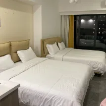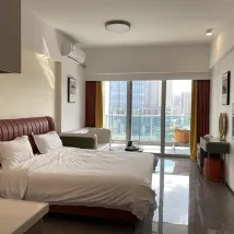 The hotel is located in the Poly International Apartment in Harbor Town. It is a relatively new building. I was given a top floor with no view. It was relatively hot and generally hygienic. There were many restaurants nearby and the transportation was convenient. There was a direct bus to Hong Kong nearby, which was very convenient.