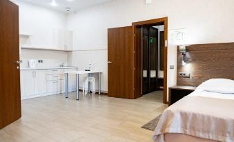 All conditions for a comfortable stay are created here — the rooms have air conditioning, refrigerator, TV, hairdryer, tea/coffee, dishes, kettle, microwave, safe, heating. For the convenience of guests, a "Literary living room" is organized - where breakfasts are held. Sauna with jade stones for a separate fee. You can choose any of the 10 currently available rooms on Yandex.Travel. Cleaning is done every day.