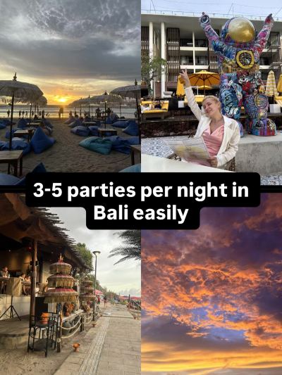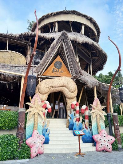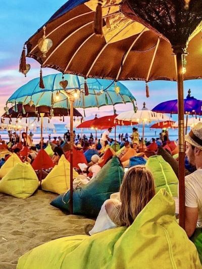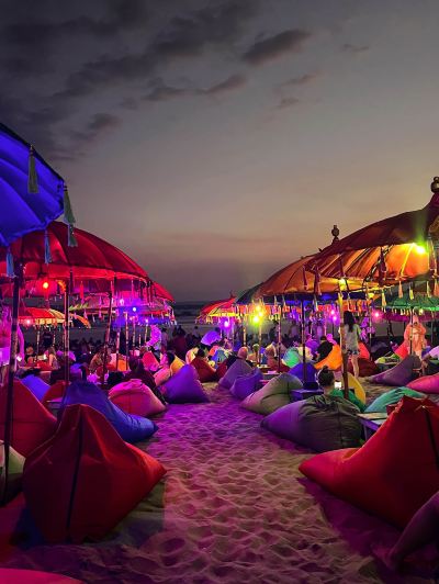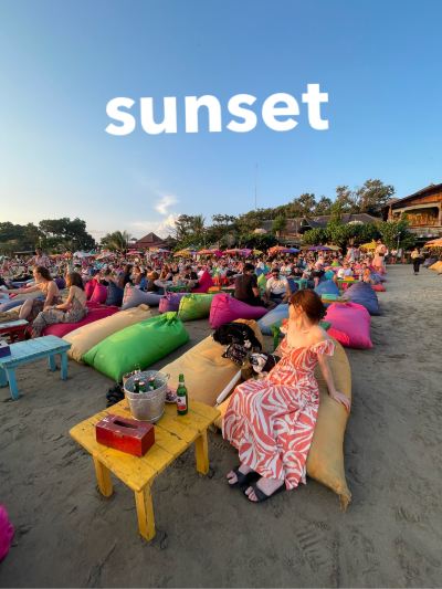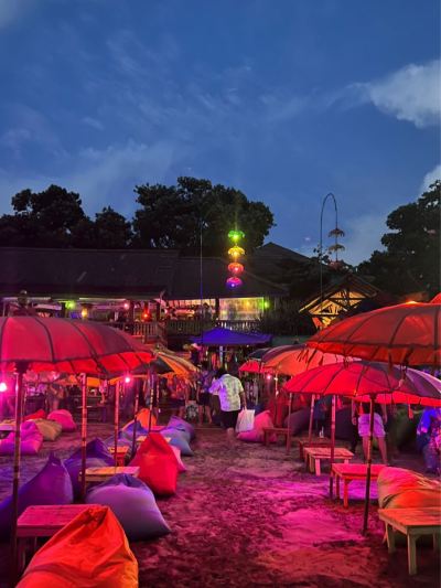 Beachfront colour We visited La Plancha twice. The building is a mixture of colours and lanterns And played great music all day. We hired the sun beds in front 1 day then transferred to their beanbags later in the day. It got really busy around sunset but it was still a lovely place to sit and watch the sunset and the people on the beach. Nice cocktails and bar snacks, but the nachos weren’t great. Bali is trying to reduce plastic use- La Plancha provided paper straws.